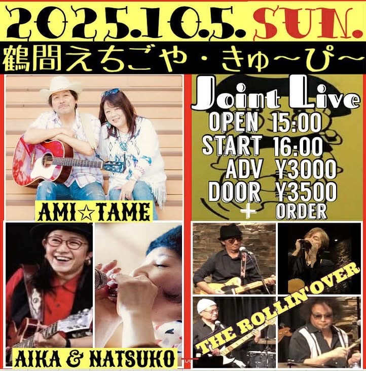 ※満員御礼 SOLD OUT! ありがとうございます!【Rockin' with the Blues Joint Live】鶴間『えちごやきゅ〜ぴ〜』15:00 開場/16:00 開演¥3,000(予約)/¥3,500(当日) +オーダー出演:AMI☆TAME、AIKA & NATSUKO、THE ROLLIN' OVER ※出演順、セッション有り※ライブ中は店内禁煙!