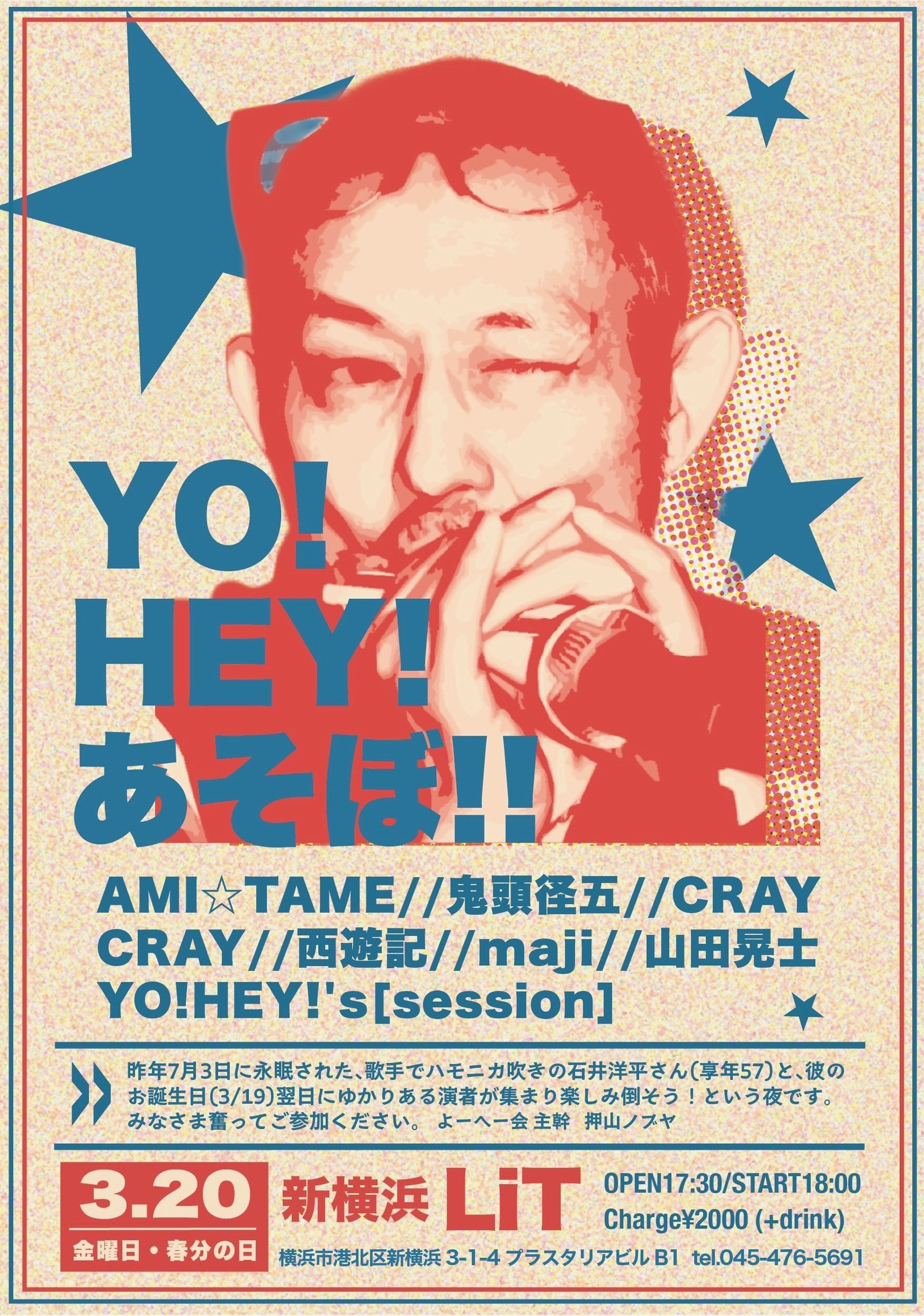 2026.3.20(祝 金)新横浜『LiT』(旧BELLS)17:30 オープン/18:00 スタートMC ¥2,000+1d出演(五十音順):AMI☆TAME、鬼頭径五、CRAY CRAY、西遊記、maji、山田晃士 YO!HEY!'s Session【YO! HEY! あそぼ!!】アミタメの弟の様な洋平がまだ若くして逝ってしまった。旅立った彼を束の間呼び戻して、彼を知る皆んなで一緒にワイワイやろうぜ!という主旨の集まりです。洋平を知る方は是非ご一緒に!