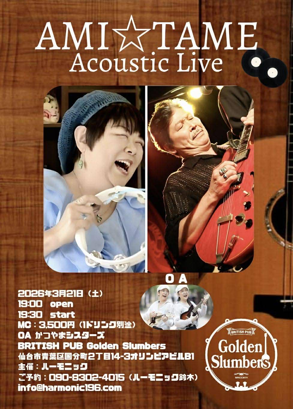 アミ☆タメ、久し振りに仙台でライブ!初めて出演する『ゴールデン・スランバーズ』、楽しみです2026年3月21日(土)Brirish Pub Golden Slumbers仙台市青葉区国分町2-14-3 オリンピアビルB1F19:00 open / 19:30 startMC:3,500+1dご予約:090-8302-4015(ハーモニック 鈴木)info@harmonic196.com