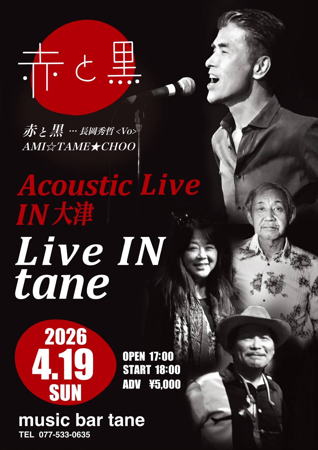 2026/4/19(日)石山(JR琵琶湖線)『tane』077 533 0635【赤と黒 Live in Otsu】出演:赤と黒/長岡秀哲(vo)サポート:庄司厚人(gtr,vo)、三松亜美(vo,perc)、中村和生(gtr,vo)17:00 open/18:00 start¥5,000(adv)